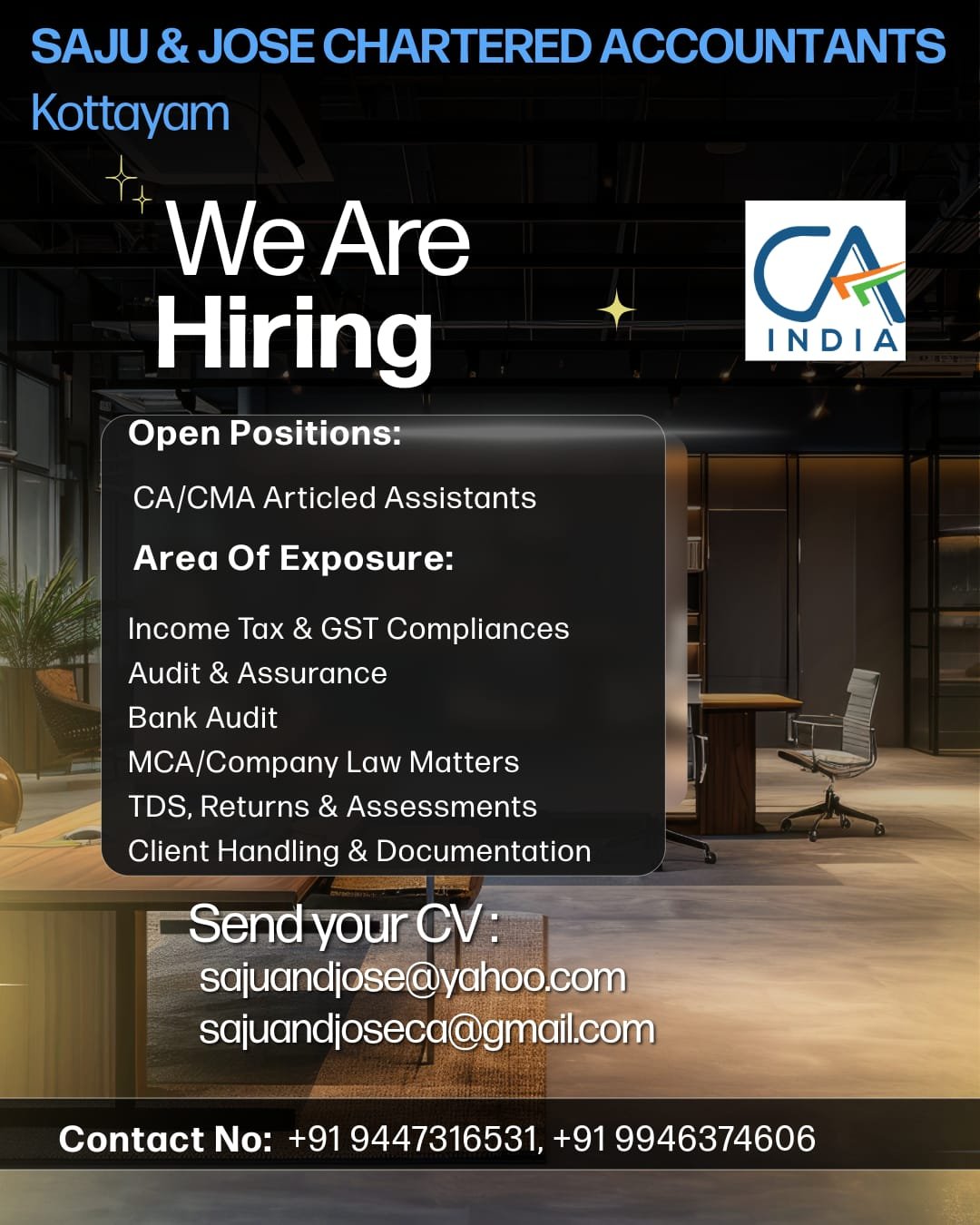 Articled Assistants Vacancies - Saju & Jose, Chartered Accountants, Kottayam Company: Saju & Jose Students 32 Views Articled Assistants Vacancies Company/Firm: Saju & Jose Address: XVII/475 CSI SHOPPING COMPLEX, KANJIKUZHY, MUTTAMBALAM P O, KOTTAYAM Phone : 9447316531, 9946374606 Email: sajuandjoseca@gmail.com Download File Category Students Share this Post